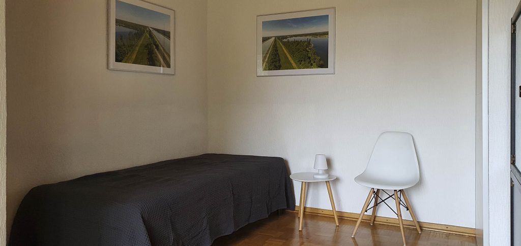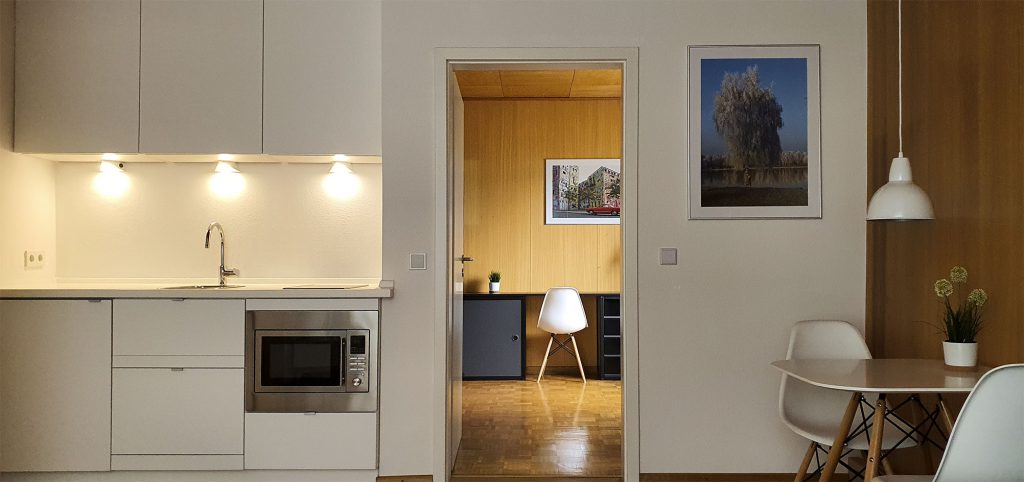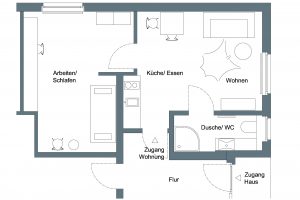 Die kleine Wohnung besteht aus einem Wohnzimmer mit Essplatz und Küchenzeile, einem Schlafzimmer mit Arbeitsplatz sowie eigenem Duschbad. Die beiden Räume haben eine Größe von jeweils 17 m². Die Fußböden sind mit Fliesen oder Eichenstabparkett belegt, alle Decken sind mit Echtholz verkleidet.